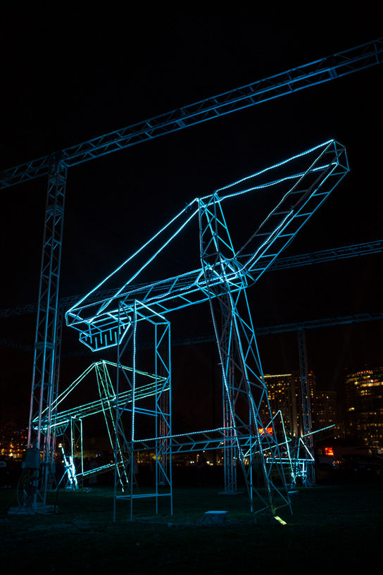 Both looming and frail, the illuminated dock crane stanchions of the Drone Prix provide a view into an anthropomorphic view of global trade through the VR headsets of pilots operating race drones at up to 60 miles per hour.